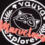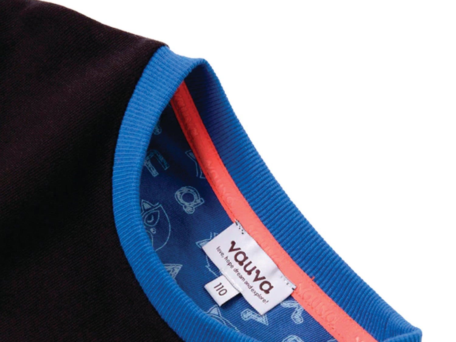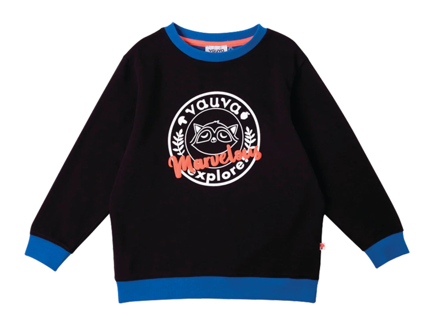 Smart and cute raccoon is finding Love, Dream, Hope and Explore in Vauvaland, he must find it out! Black with white and shape orange raccoon print with blue detail strip, let you to be a smart and trendy boy. Sweatshirt made by cotton, soft, comfortable and warm.