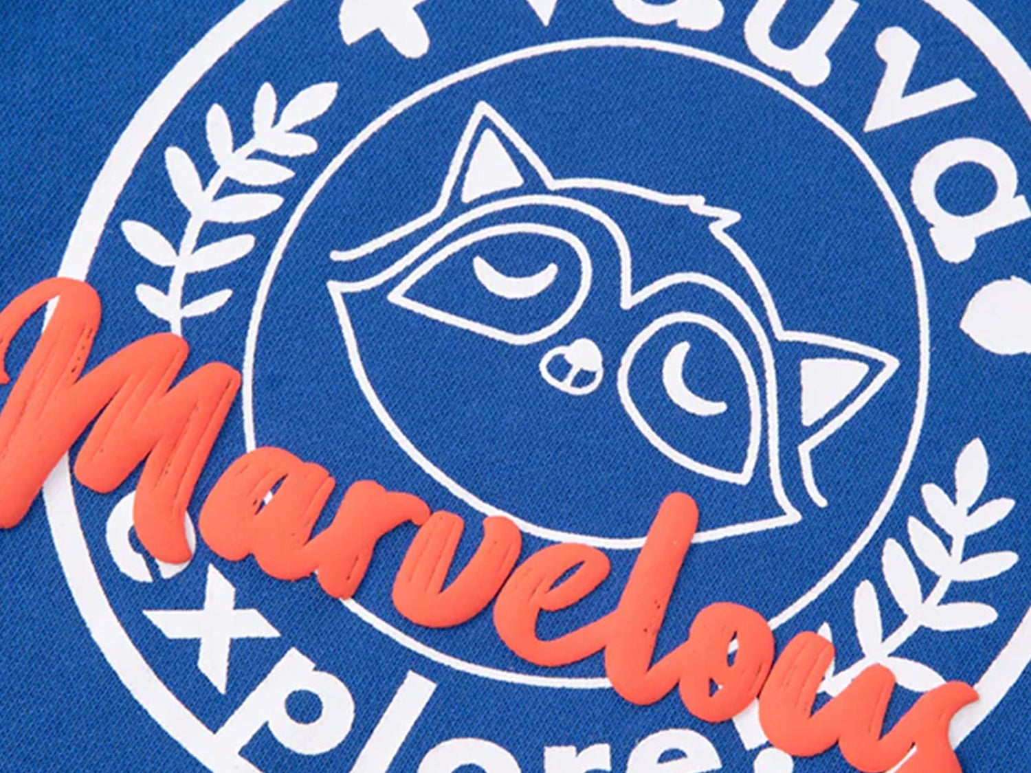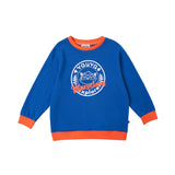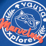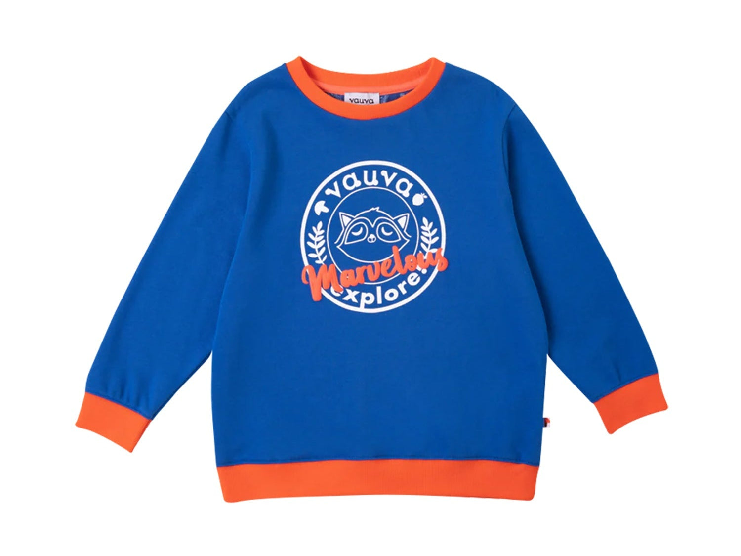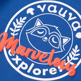 Smart and cute raccoon is finding Love, Dream, Hope and Explore in Vauvaland, he must find it out! Smart blue with white and orange raccoon print with orange detail strip, let you to be a smart and trendy boy. Sweatshirt made by cotton, soft, comfortable and warm.