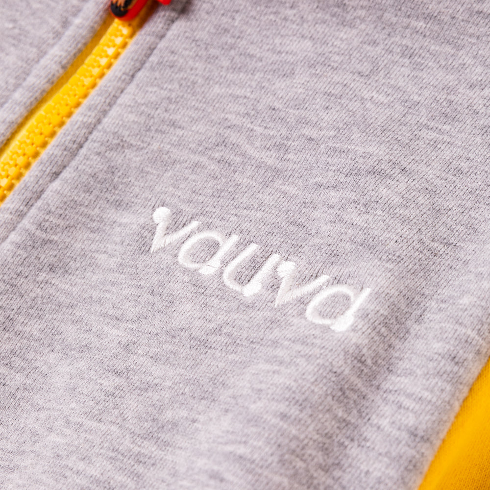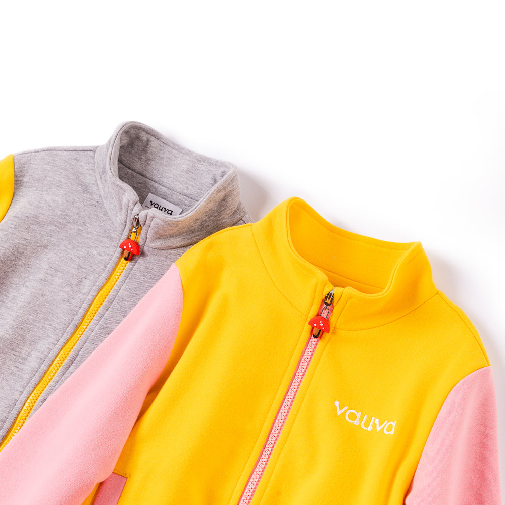 Cool Grey and shape yellow contract design with a little mushroom zipper and embroidery Vauva logo, leisure and decent style to let you wear it any where in this autumn and winter.